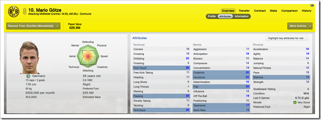 Disitu Gotze mendapatkan nilai 4.5 untuk dibeli, berarti doi bener-bener pemain yang bagus. Dan tidak heran kalau sekarang doi sudah memiliki atribut yang istimewa dan mungkin sudah tidak berkembang lebih jauh lagi. Tapi tidak menutup kemungkinan untuk berkembang dikemudian hari, tentunya dengan training yang tepat.