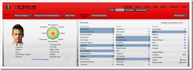 Lihatlah determination dan work rate yang dia miliki, Leali menjadi kiper yang top markotop diumurnya yang masih 27 tahun. Tapi kalau dibandingin sama buffon jelas masih jauh, tapi bermain untuk Napoli menunjukkan jika dia merupakan kiper yang cukup berkualitas. Keunggulannya ada di Aerial Ability. Communication dan goalkeeping attributenya pun naik. Dia memang bukan tipe 'Legendary Goalkeeper' tapi dia bisa dikatakan kiper yang cukup bagus.